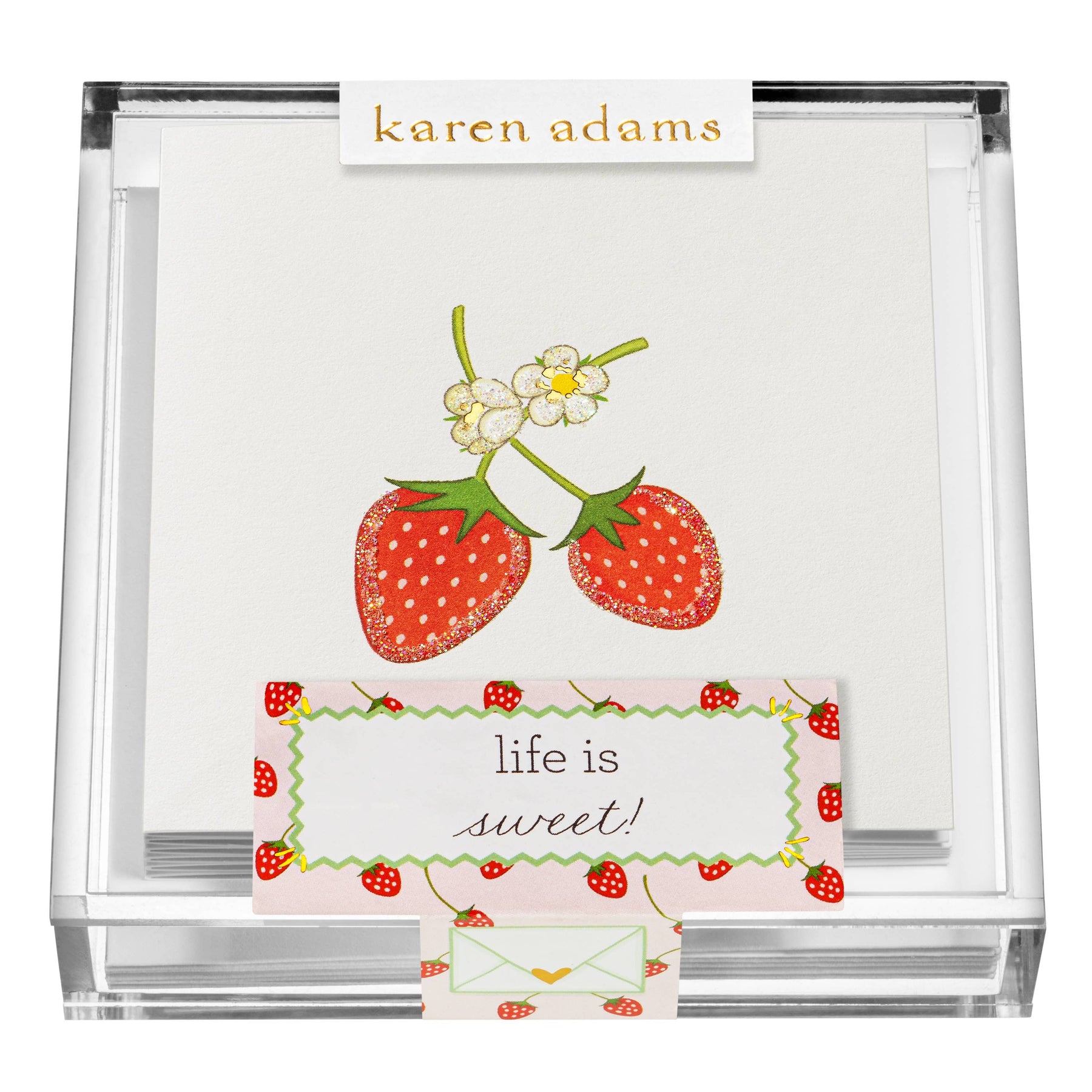 Life is Sweet with this perfectly adorable box of hand-glittered cards featuring a strawberry. Book folded cards, blank on the inside.