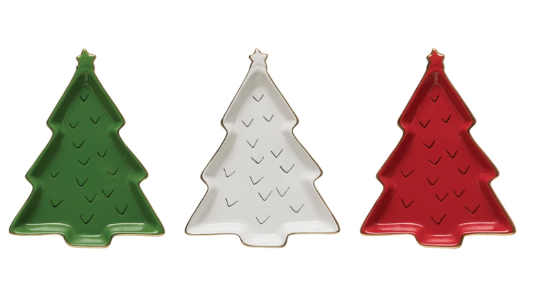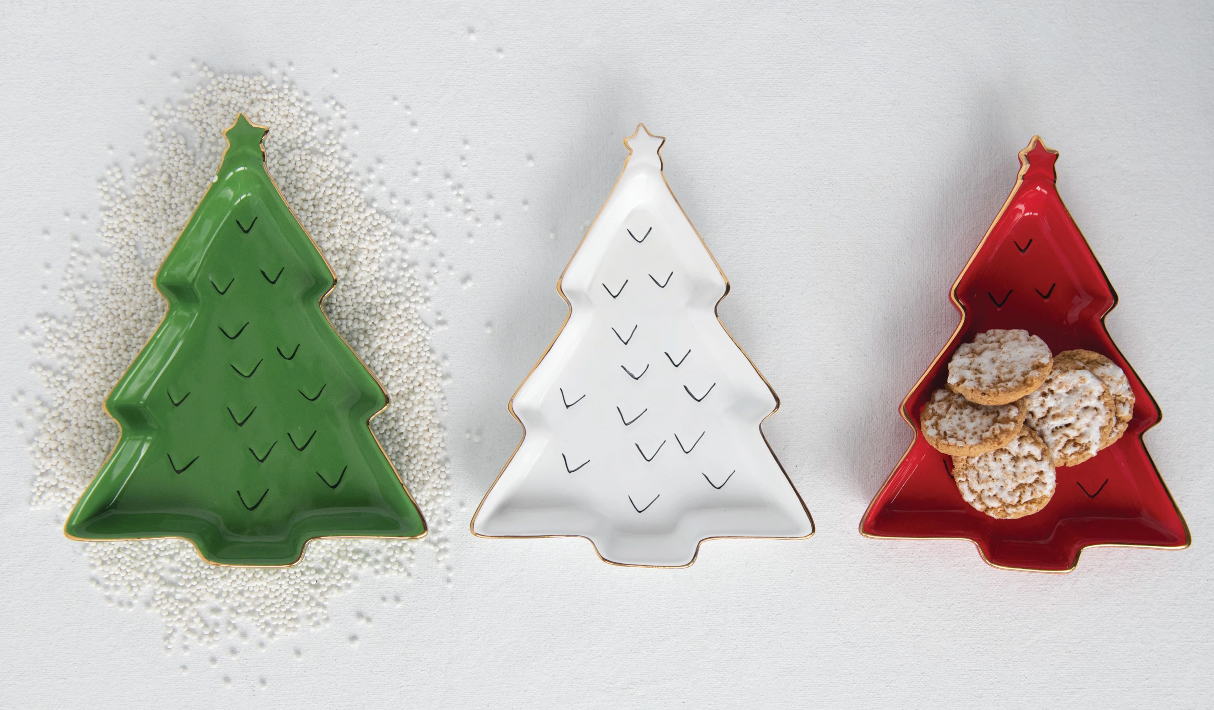 Serve holiday desserts in one of these tree shaped stoneware dishes. They come in green, white and red and feature decorative gold electroplating around the rim. One can also be used as a base for a collection of glass encased holiday candles.