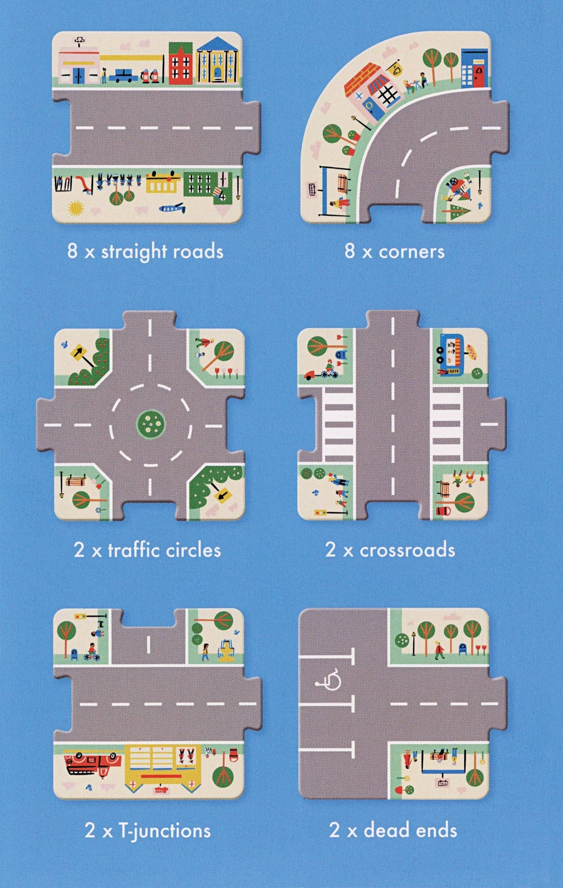 Busy Town brings inspiration to little imaginations! Design a new world every time you play with these 24 interchangeable, double-sided puzzle pieces. (Pictured car and road sign figures from Busy Town 3D Play Set not included.) Ages 3 and up.