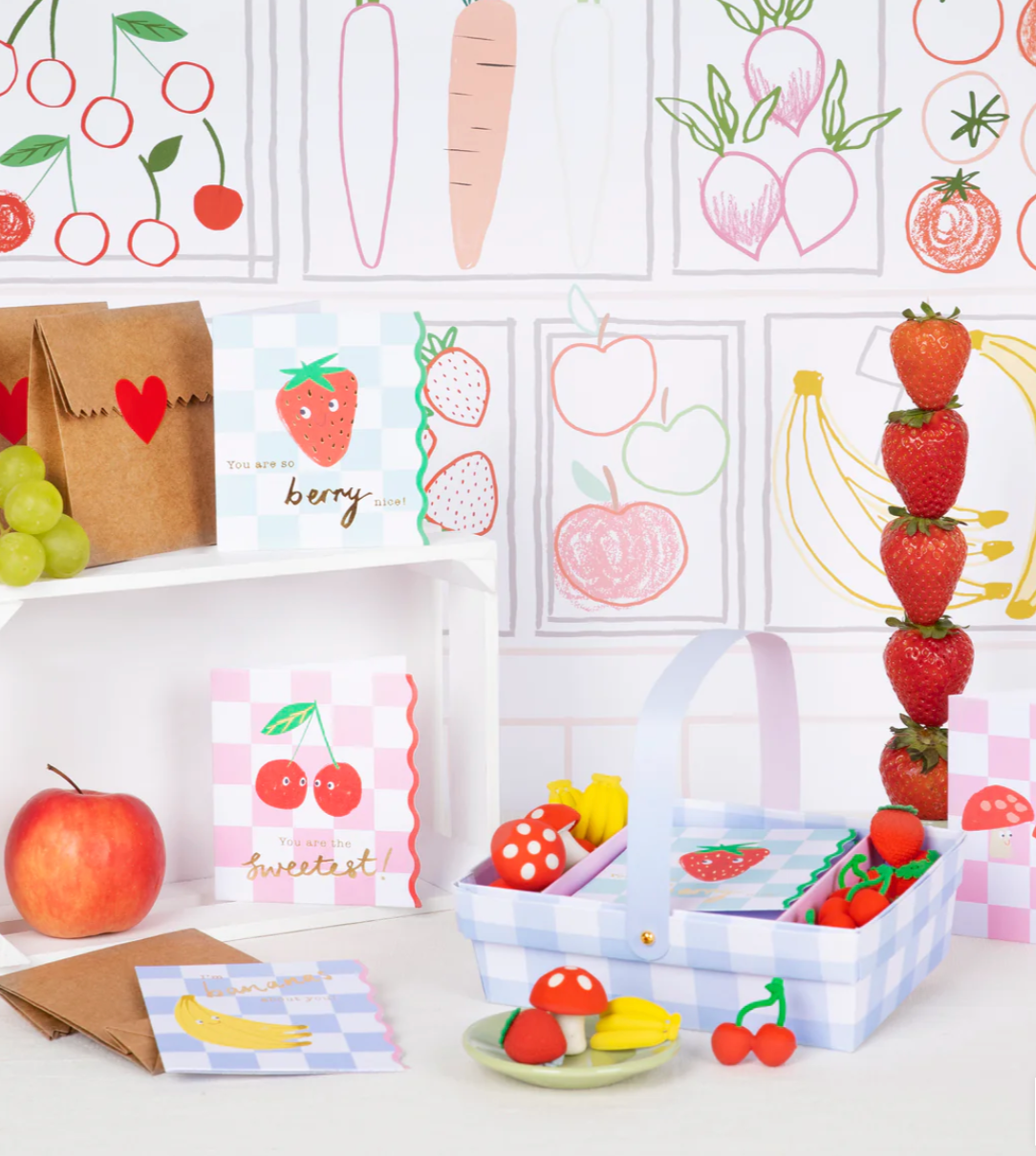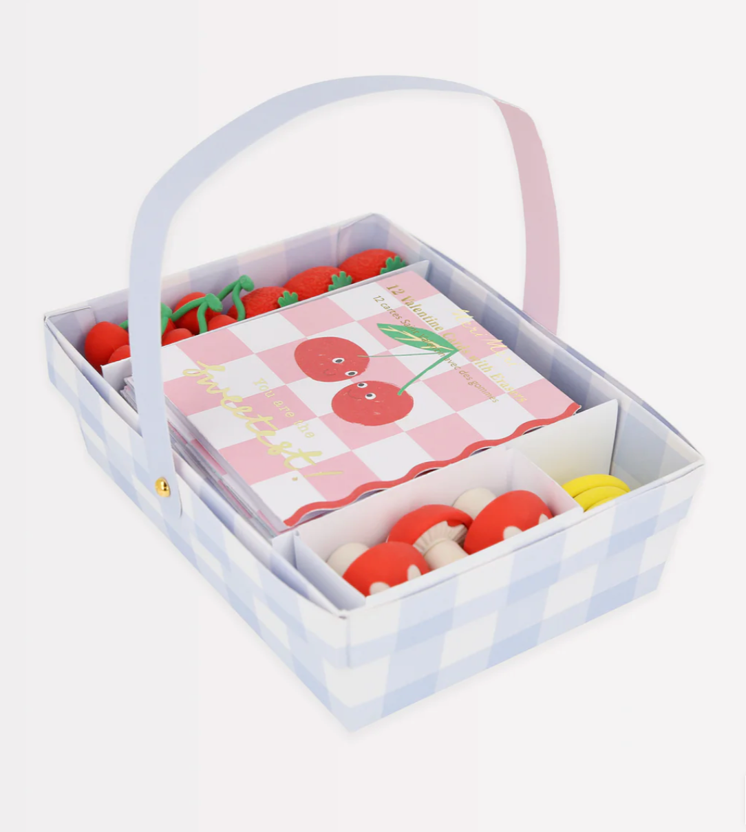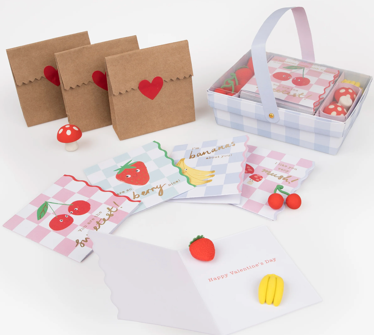 Here's a special container filled with love! Our talented designers have crafted a charming gingham paper punnet filled with fruit-themed Valentine's cards and matching fruit-shaped erasers. To top it off, you'll also receive little brown paper bags with heart stickers, adding a unique twist to traditional envelopes. Recipients are sure to swoon over these delightful Valentine's gifts!