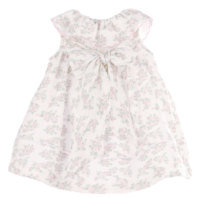 Our Evelyn Dress encapsulates elegant style. Featuring pleated detail on the bodice and skirt, a gathered collar, sophisticated puff sleeves, sweet bows at the front, and a button closure at the back.