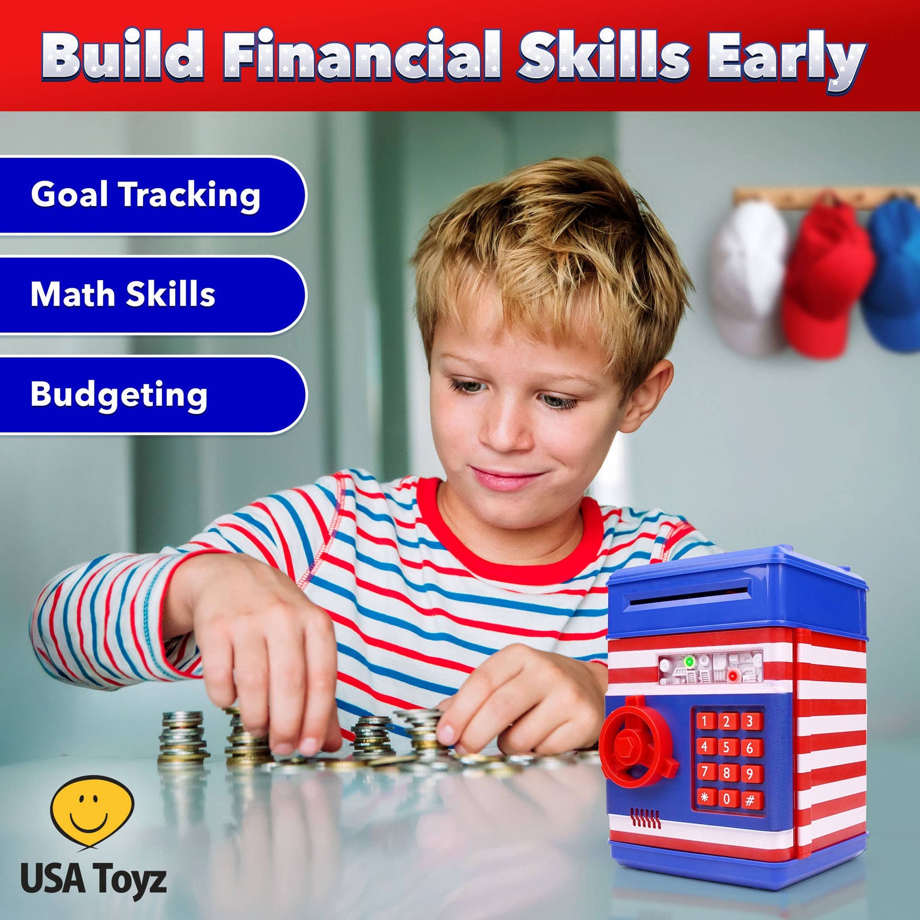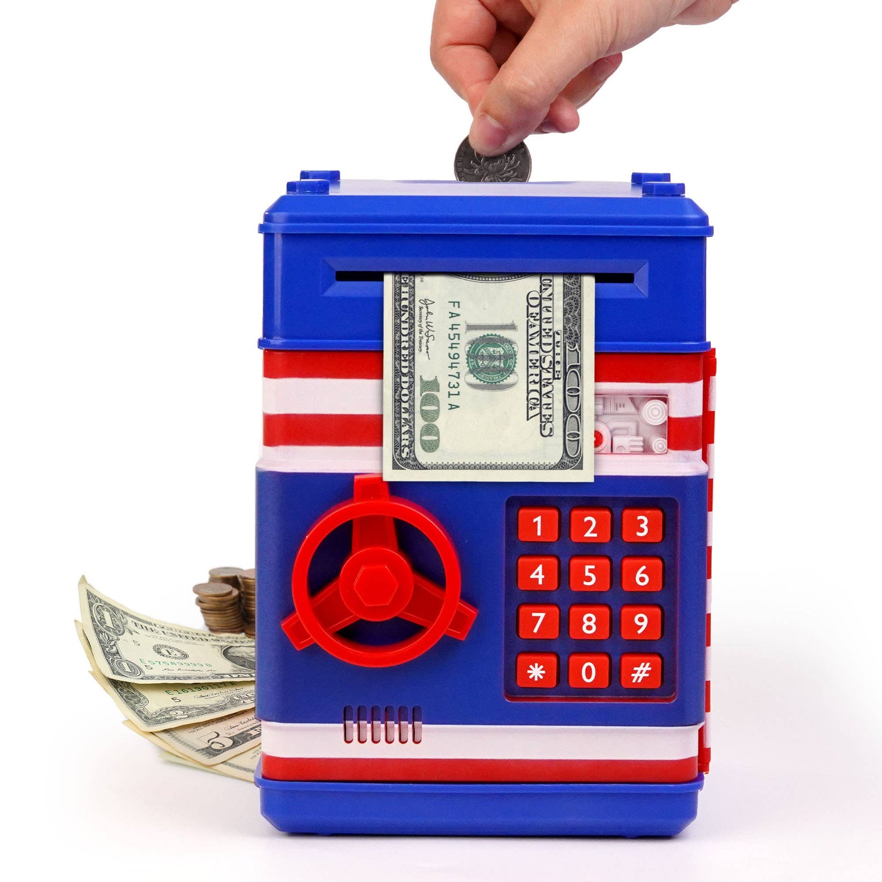 Electronic Piggy Bank for Kids: The USA Toyz patriotic-themed electronic piggy bank with code doubles as a vault-style money safe and features a working keypad, light-up LEDs, automatic bill feeder, and fun sound effects that simulate real ATM machine use for realistic financial play.