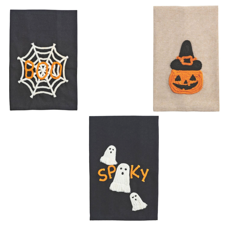 Regular price $13.00Hey boo, you'll love our Hey Boo Halloween Hand towel. The cotton hand towel features a chunky French knot icon in the shape of a ghost. The hand towel has a black background with an image of a ghost in the center. Underneath the ghost the hand towel reads "hey boo".