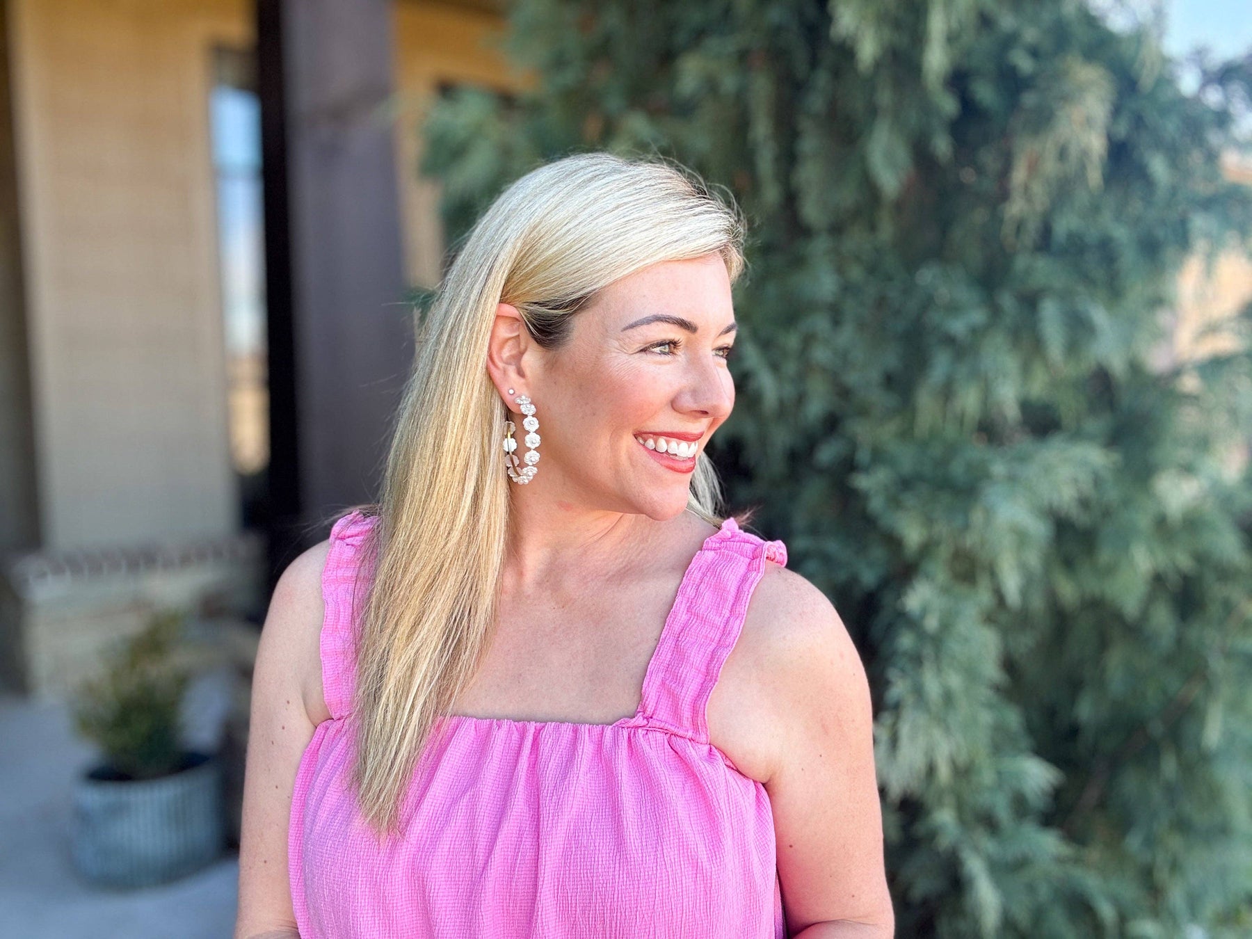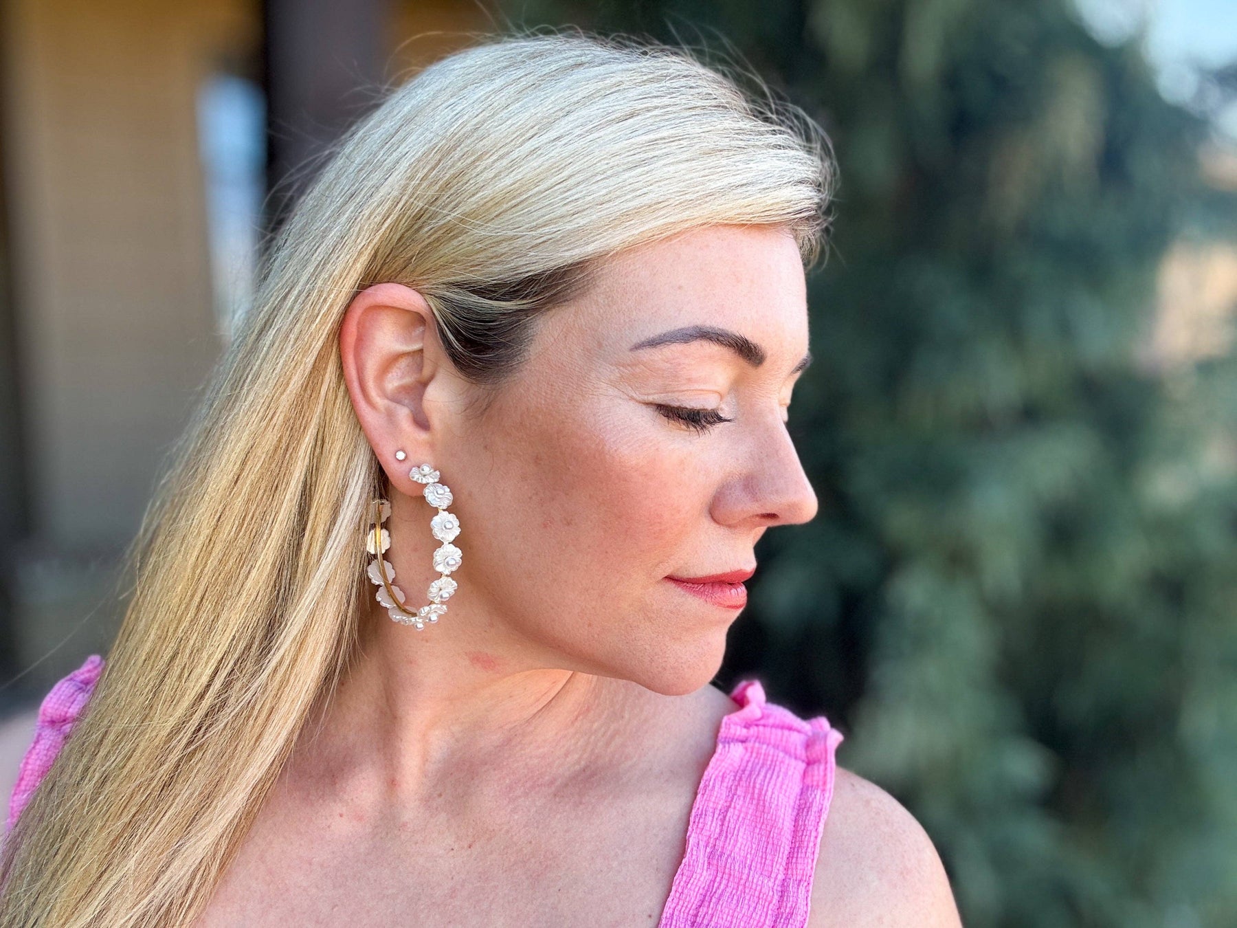 The perfect touch of delicate elegance. Our Pink Pearl Hoops feature two lustrous pearls and a dainty array of pastel-hued blossoms along the rim. Perfect for a casual day out or cocktail hour with friends, these versatile hoops are a must-have addition to your jewelry collection.