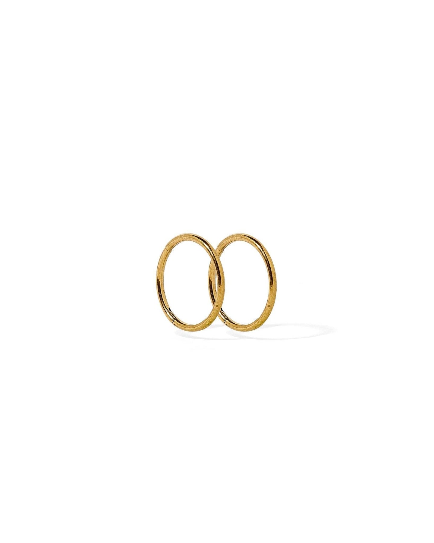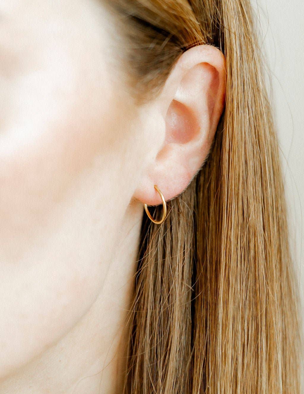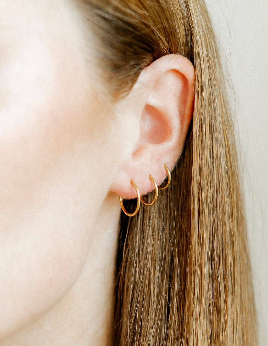The Ava Gold Infinity Hoops in 10mm bring a sleek and effortless look to everyday style. Their seamless snap-together closure creates a continuous, polished finish, making them a versatile staple for any jewelry collection. Crafted from hypoallergenic, nickel-free materials, these lightweight huggies are safe for sensitive ears and comfortable enough for all-day wear. Slightly smaller than the 12mm size, they offer a subtle yet sophisticated touch whether worn solo or layered with other hoops.