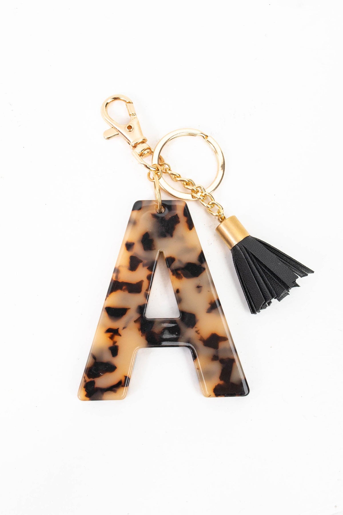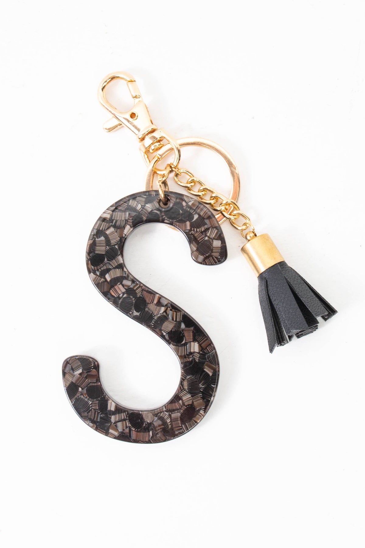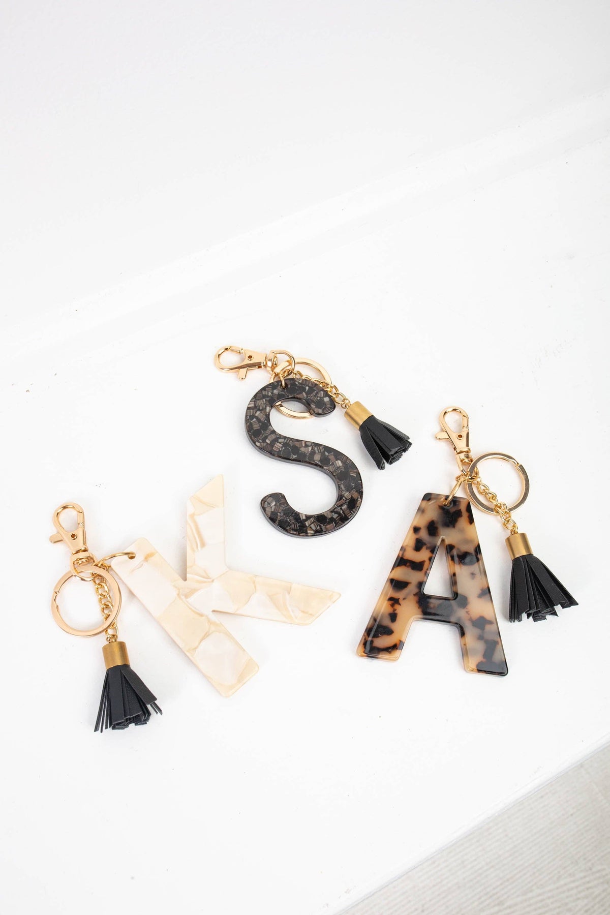 A beautiful letter keychain to help you keep your keys organized. Made with highly durable acetate material, each initial key chain can also be used as a bag charm to add a touch of personalization to your accessories. The faux leather tassel embellishment gives a striking appearance, while the golden hardware chain, lobster clasp, and jump ring make this charm functional for many uses. Each piece is crafted with attention to detail for a modern and eye-catching look. This letter keychain is perfect for use on a handbag, pouch, or backpack, and comes with a small V&B hanging price tag.