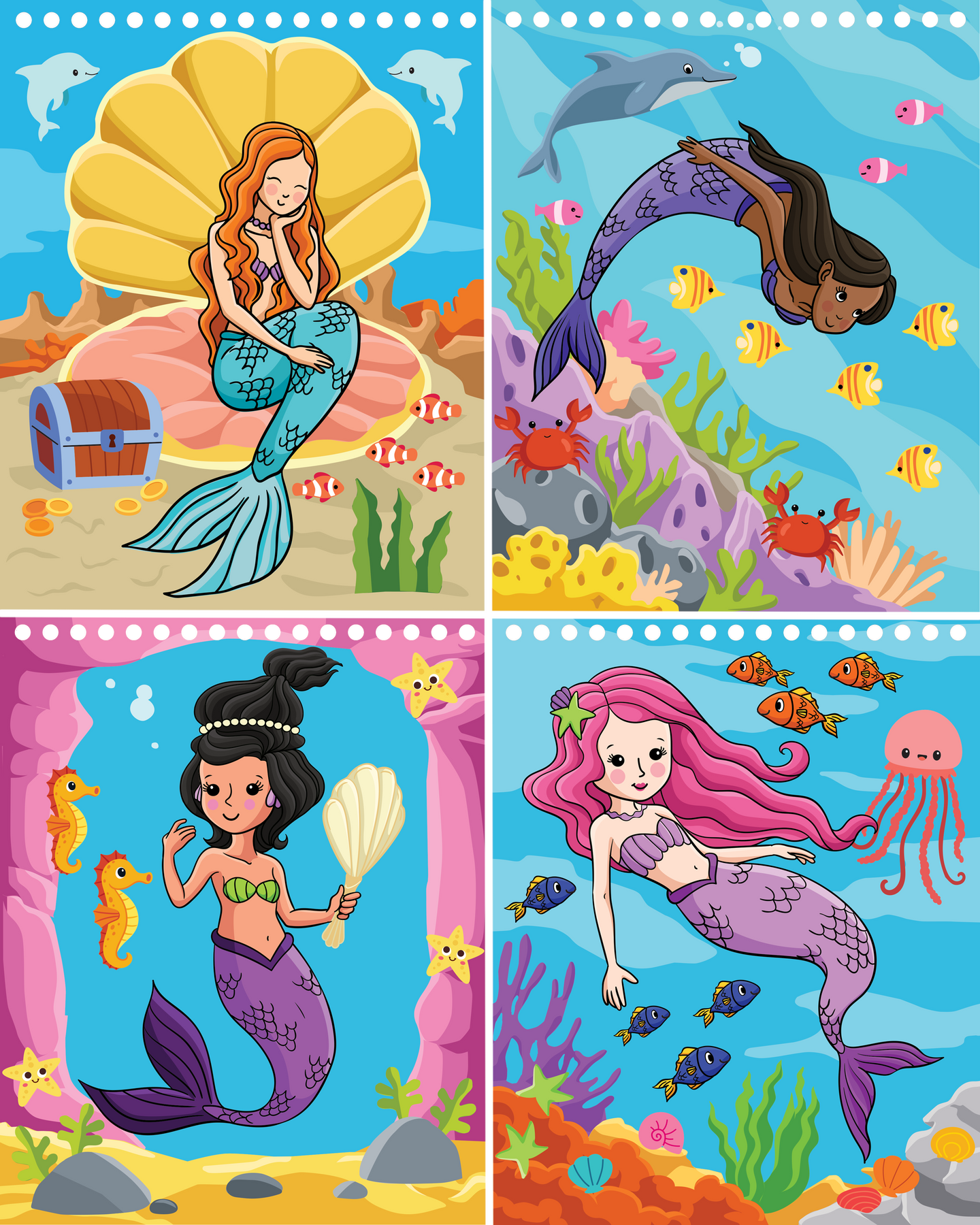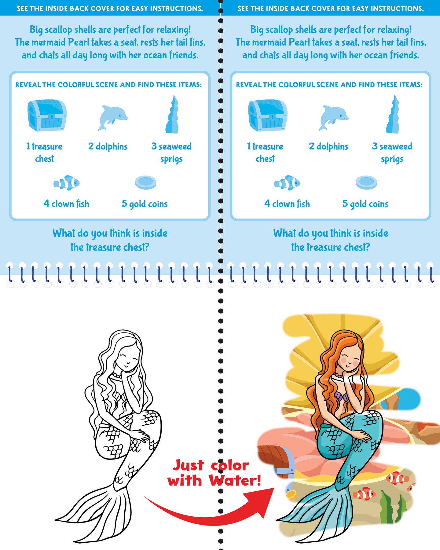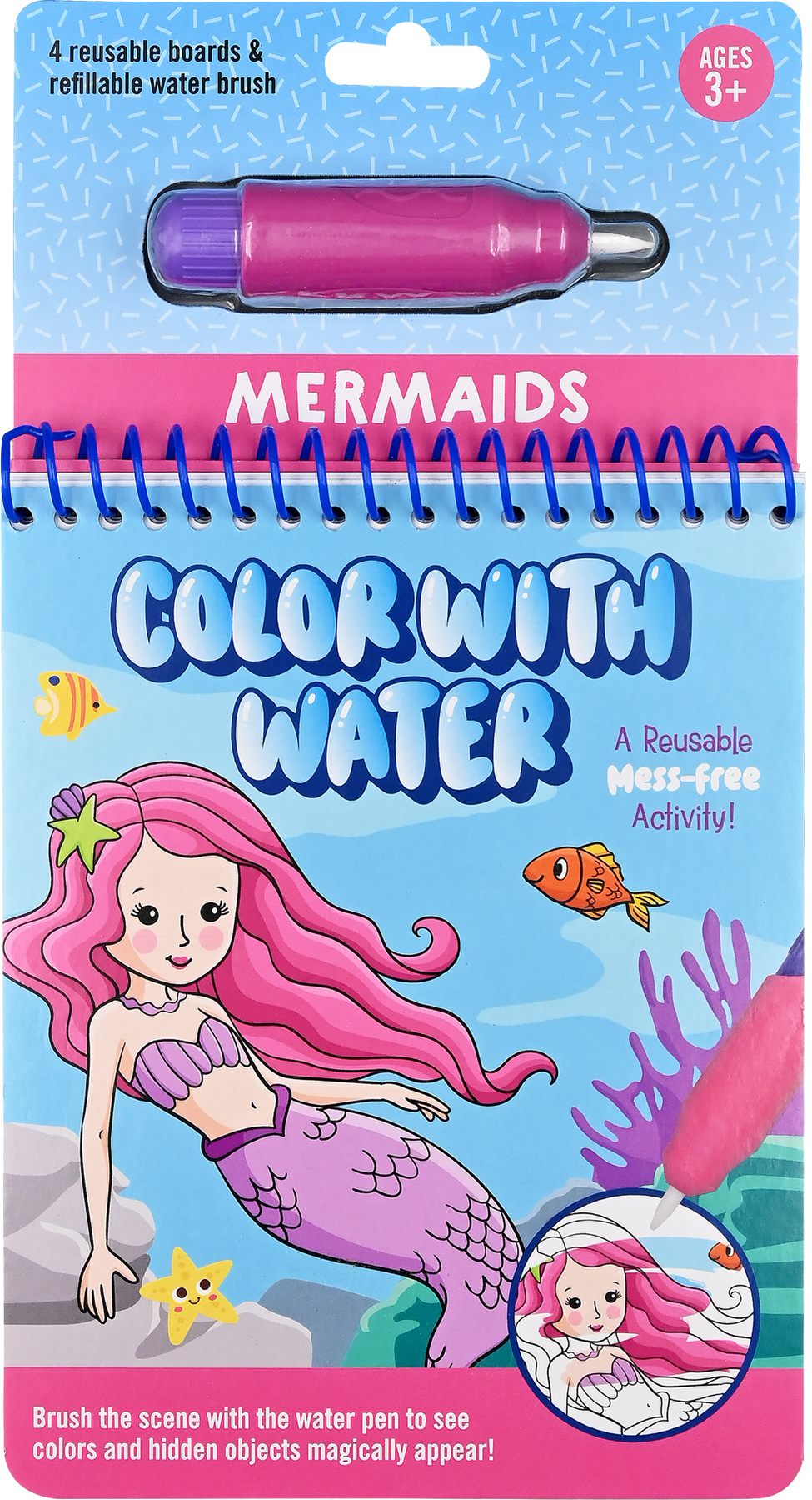 Explore the marvelous world of mermaids with water art! This no-mess art and seek-and-find activity will delight kids and parents alike!   How it works: Simply use the water pen included to brush each scene with water and watch as colors and hidden objects appear like magic!  Easy and fun: Remove water pen. Unscrew pen and fill its base with water. Screw on cap. Press pen down gently to wet the tip. Brush each scene with wet pen tip to make colors and hidden items appear!  When the picture dries, the colors disappear. Simply brush again with water to make the colors return!  When finished, empty the pen and store in its case.   Fun at home or on the go!  Comes with 4 reusable mermaid scene boards and refillable water brush pen with built-in case!  Ages 3 and up.  Art activity set measures 6'' wide x 11'' high.