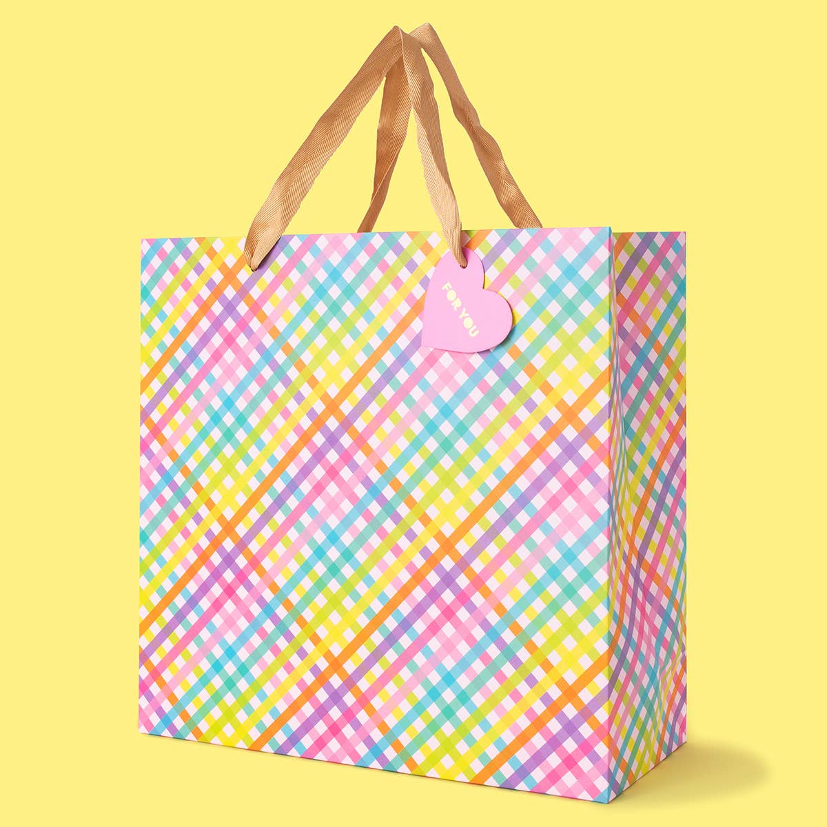MINIMUM QUANTITY: 4 Details ♥ Large Size: 12.5" x 13" x 5" ♥ Medium Size: 9.5" x 8" x 4" ♥ Small Size: 5" x 5" x 3" ♥ Colorful gingham pattern printed on gift bag ♥ Pink "For You" heart gift tag ♥ Gold ribbon handle ♥ Imported Our gift bags are unique, fun bags for wrapping birthday presents, Christmas gifts, teacher gifts, party favors, baby gifts, gifts for women. Holiday wrapping paper. Christmas wrapping paper