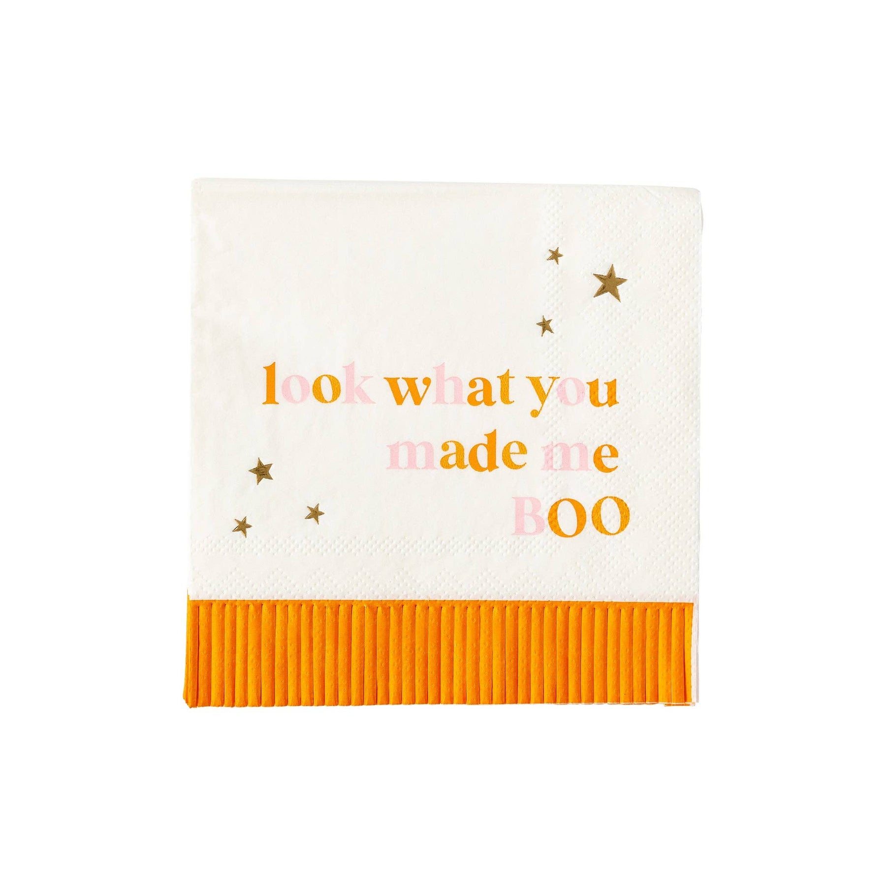 Spooky, yet stylish, our Made Me Boo Cocktail Napkin is the perfect addition to any Halloween party. With the playful phrase "look what you made me boo" printed on it, this napkin is sure to bring a smile to anyone's face. Get ready to celebrate your spooky era with this fun party essential.
