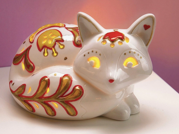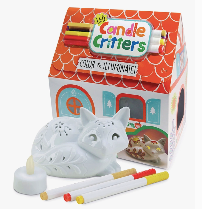 • Scandinavian-inspired and generously sized, this ceramic night light has beautiful raised details and lacy cut outs that are perfect for coloring. • Use the red, yellow and metallic gold ceramic markers to decorate the fox, then turn on the LED tea light and display! • If you make a mistake, simply wipe away with a damp cloth. Color permanently sets in 24 hours. • Packaged in an adorable cottage-shaped box with peek-a-boo windows. • Package measures 6.5” x 7.5” x 5”