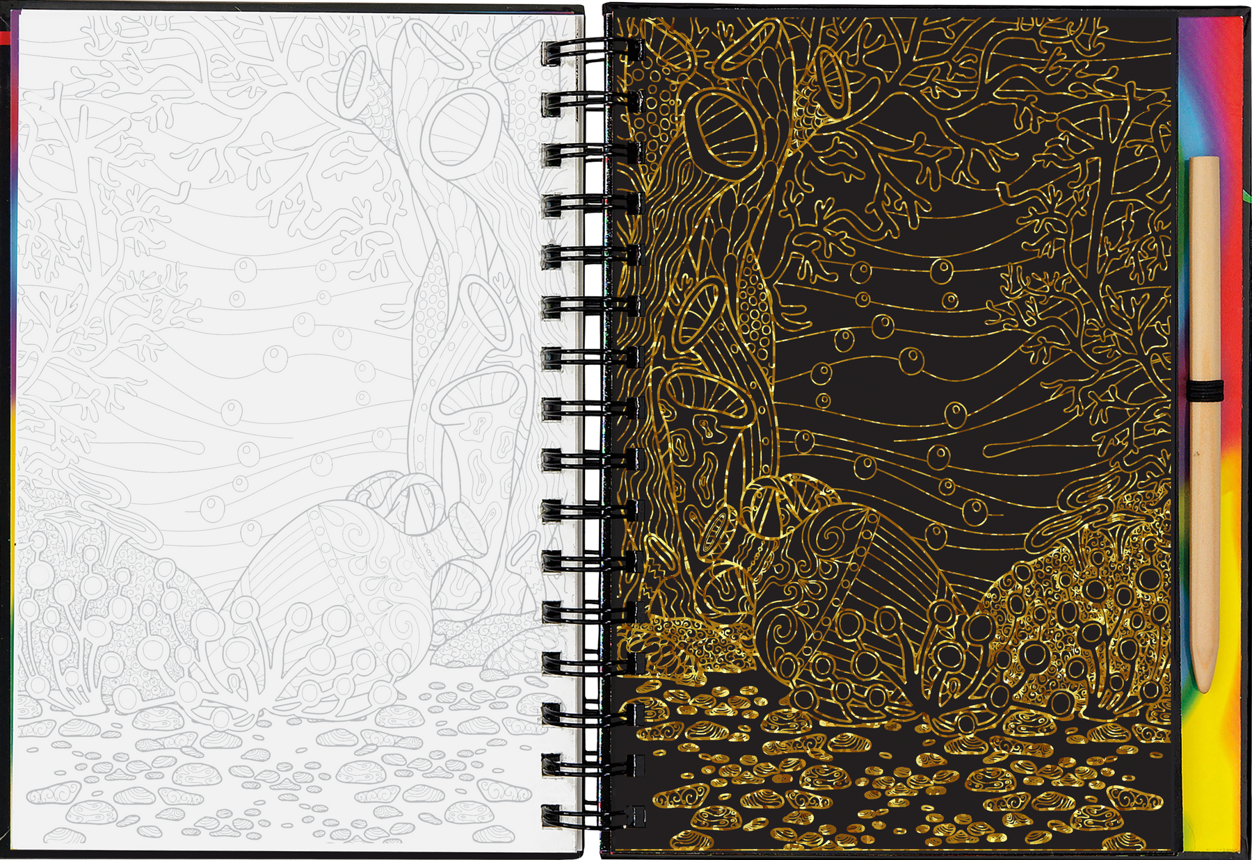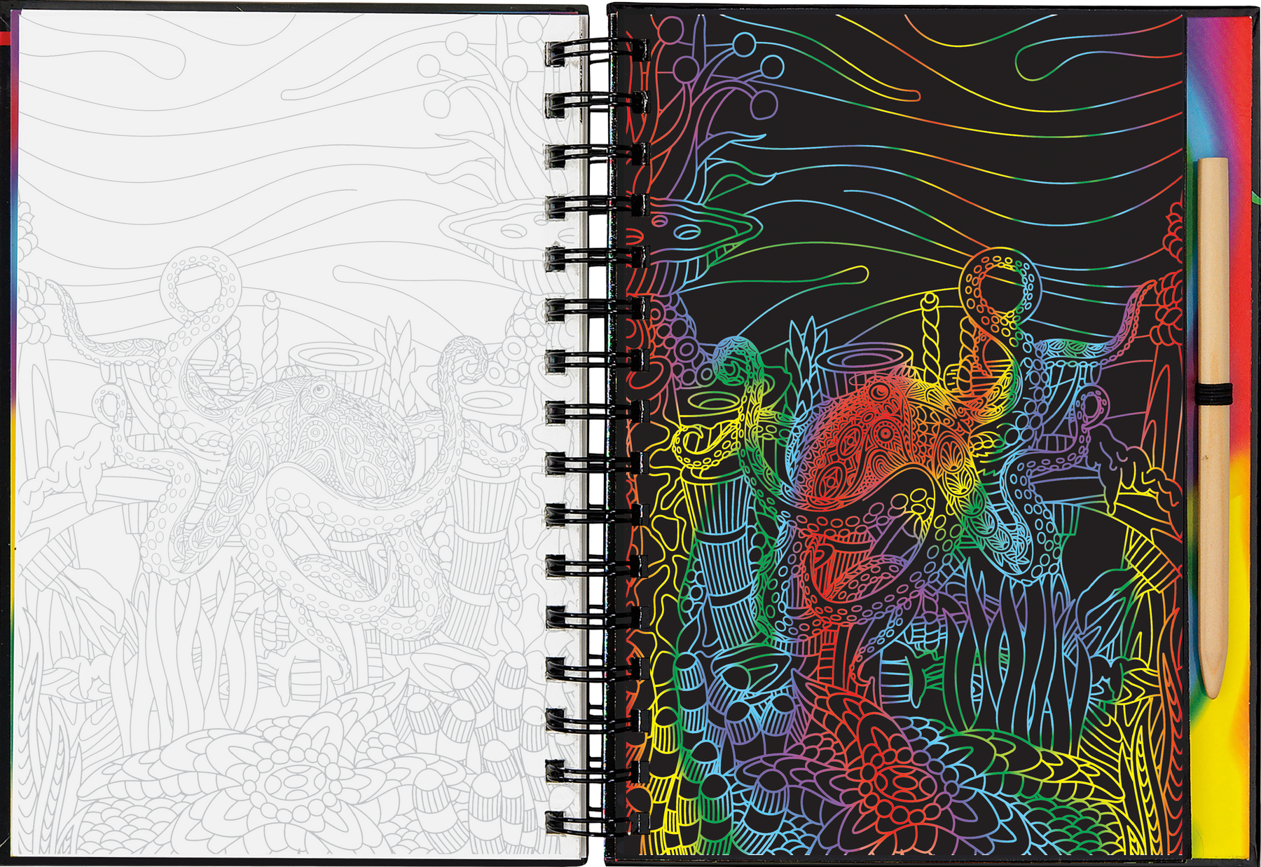 Artists ages 8 and up will go wild with Scratch and Sketch Extreme! Undersea World! Use the super-fine stylus included to trace the white lines on each black-coated page, uncovering undersea art that sparkles and shines. Scratch and Sketch: Extreme! art activity book is packed with oceanic subjects, from sharks to shipwrecks! The right-hand, black-coated pages feature intricate art for tracing to reveal brilliant golds, silvers, greens, or rainbow glitter beneath. Left-hand pages are coloring pages, ready for you to get creative with markers or colored pencils. 20 extra pages are included in the back for independent drawing and sketching. Ages 8 and up. The stylus for tracing comes shrink-wrapped with the book. Sturdy wire-o hardcover binding. Art activity book measures 6-3/8'' wide x 8-1/2'' high. 64 pages. Non-toxic. Potential eye irritant. Avoid inhaling particles of scratch coating. Not for children under 5 years. Meets all applicable safety standards.