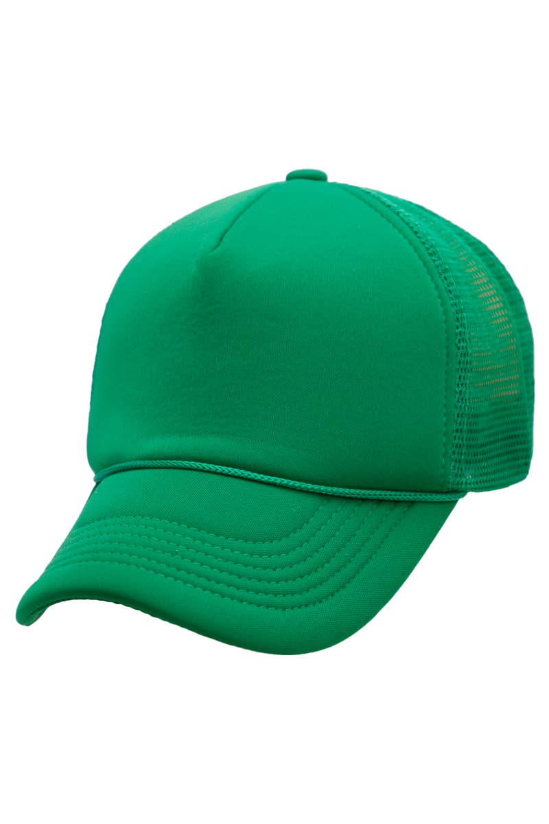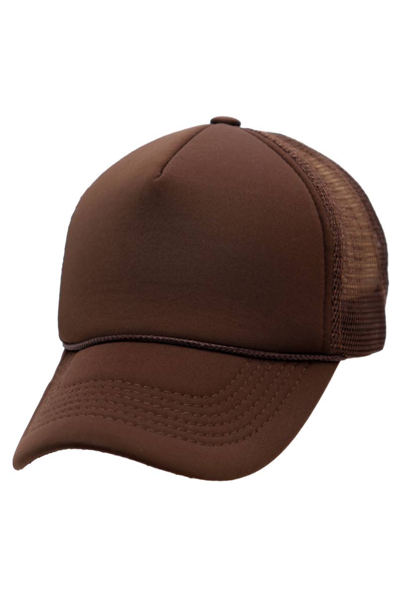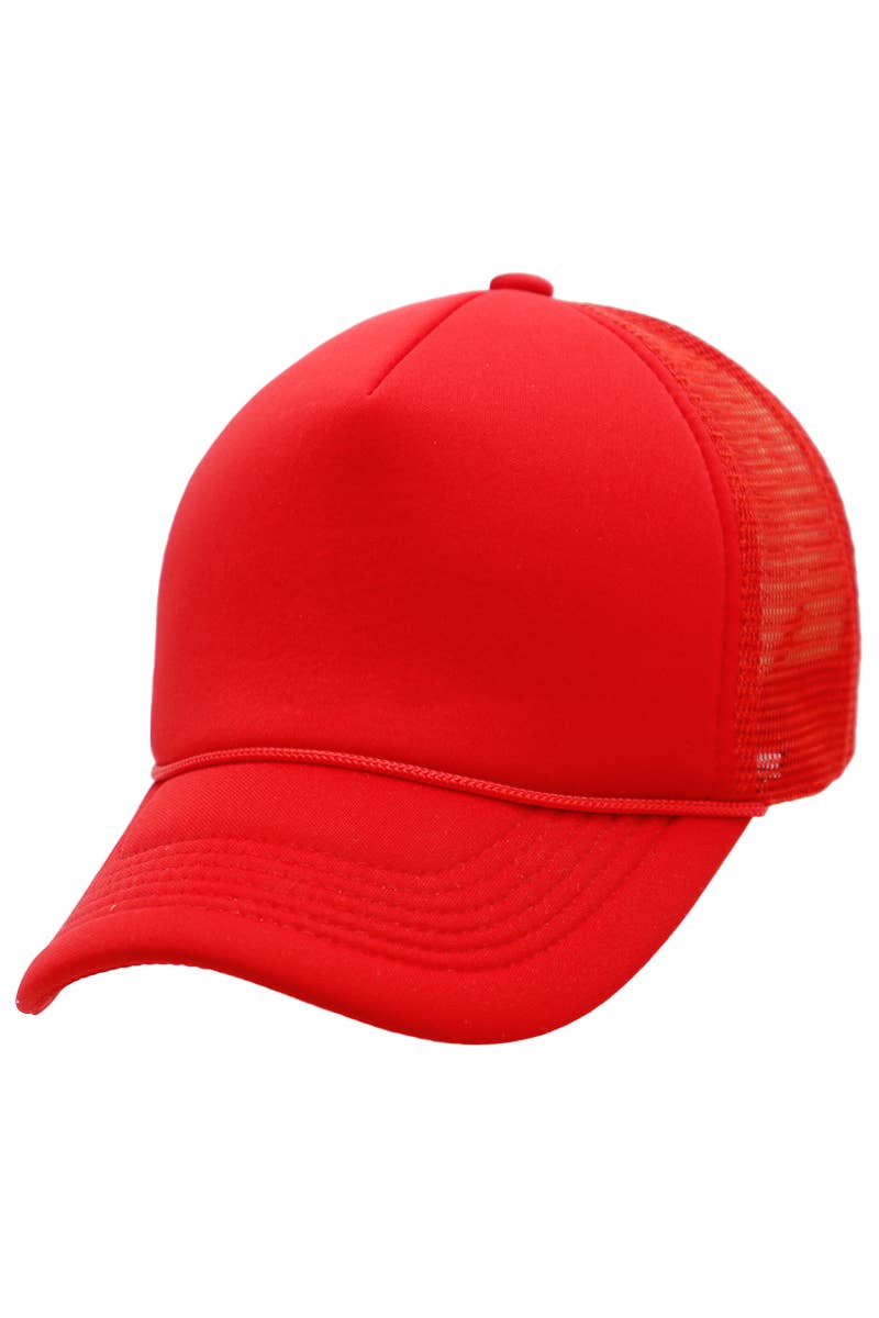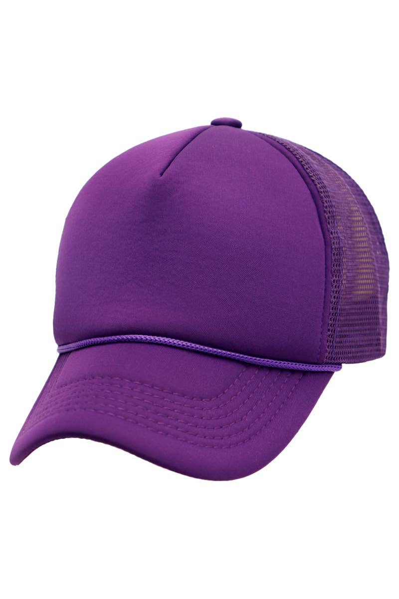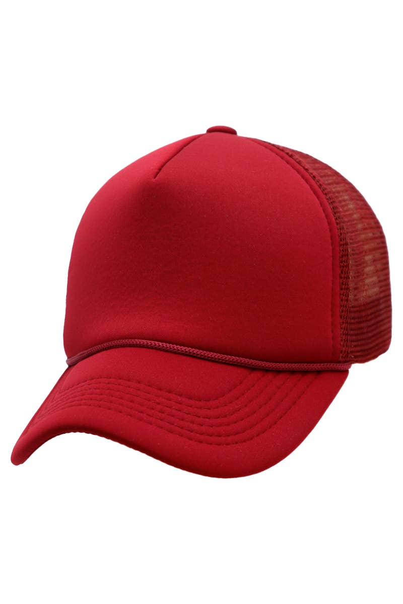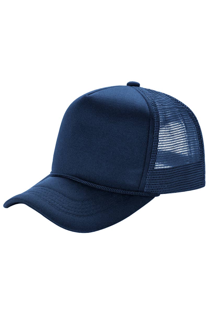 Solid Classic Five Panel Polyester Fabric Trucker Hat -Features Sennit String Rope, Sponge Padded Foam Insulated Front Panel Curved Bill with Breathable Mesh Snap Back Rear Panel -100% Polyester